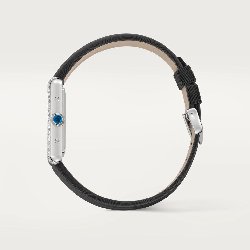 商品特性タンク マスト ウォッチ、SM、クォーツムーブメント。スティール製ケース、ベゼルにブリリアントカット ダイヤモンド40個(0.39ct)、パール状の飾り付きリューズにカボションシェイプ シンセティック スピネル、シルバーダイアル、ブルースティール製剣型針、ブラックブラッシュカーフスキン ストラップ、スティール製アルディロンバックル。ケースサイズ:29.5 mm x 22 mm、厚さ:6.6 mm。日常生活防水。