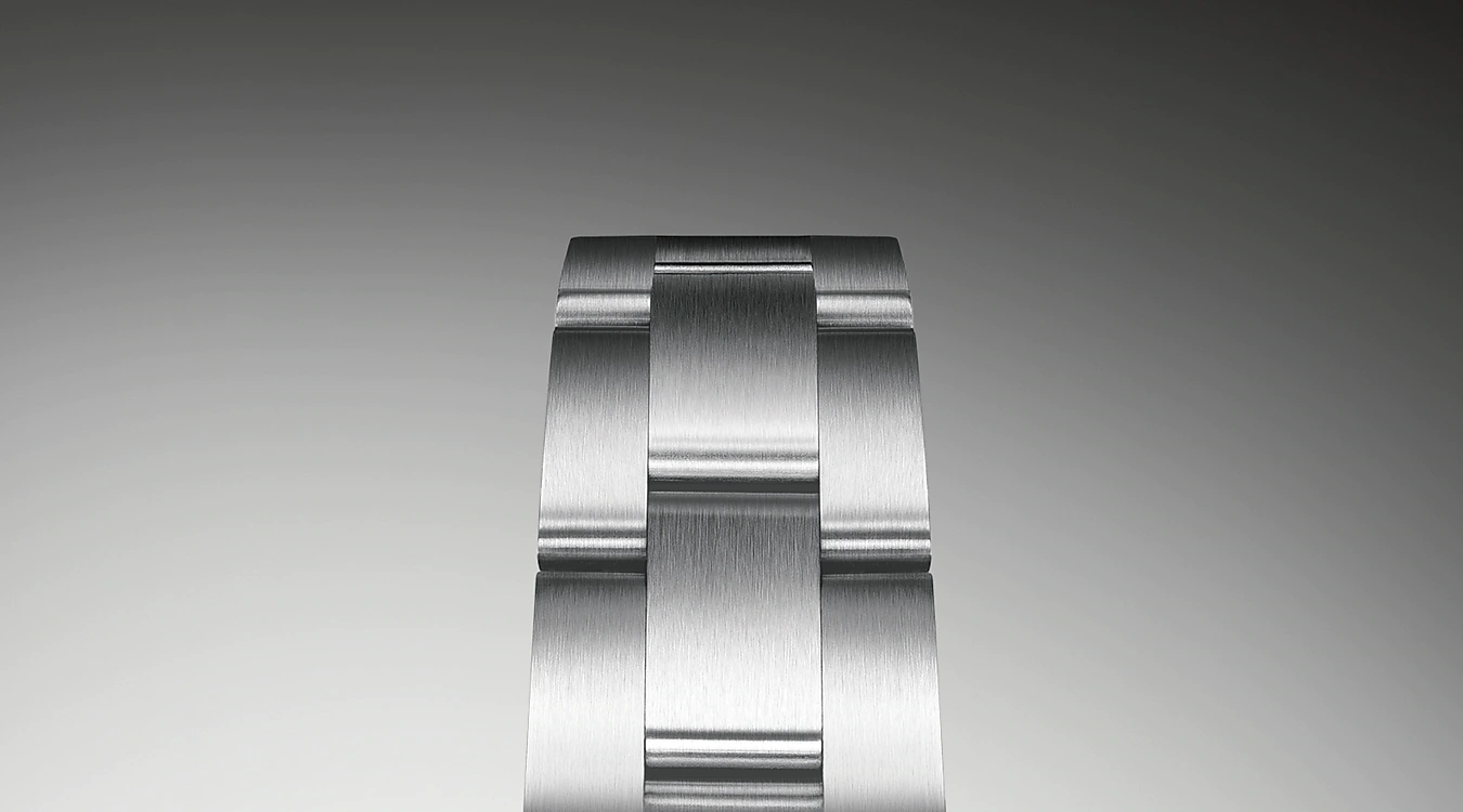オイスターブレスレットは 形と機能 美しさと技術の完璧な融合である。1930年代後半に初めて発表された極めて堅牢で優れた金属のブレスレットで 幅広の平らな3列リンクで構成された オイスターコレクションの中で最も一般的なブレスレットである。オイスター パーペチュアルモデルでは オイスターブレスレットにオイスタークラスプが採用されている。