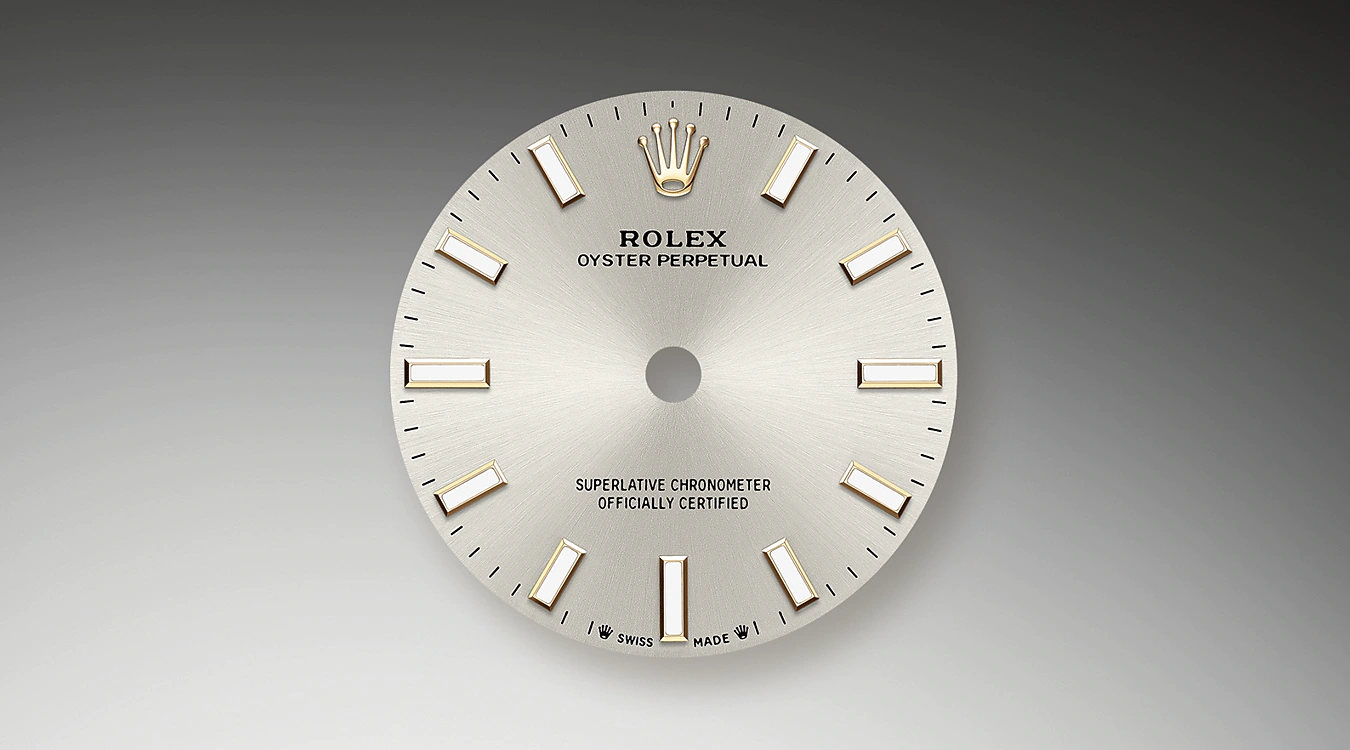 サンレイ仕上げは オイスター パーペチュアルコレクションの多くのダイアルに繊細な光の反射をもたらす。これはダイアルの中心から外側に向かって溝を作る 熟練のブラッシング技術によるものだ。光はそれぞれの彫りに沿って均一に拡散され 手首の位置に応じてわずかに動く 特徴的な輝きを生み出す。