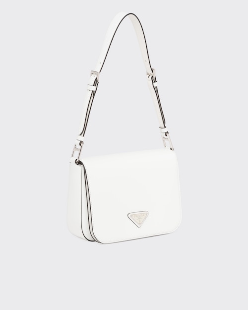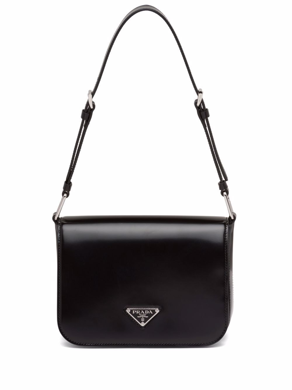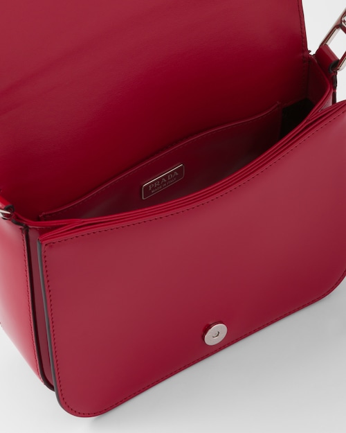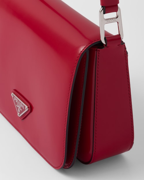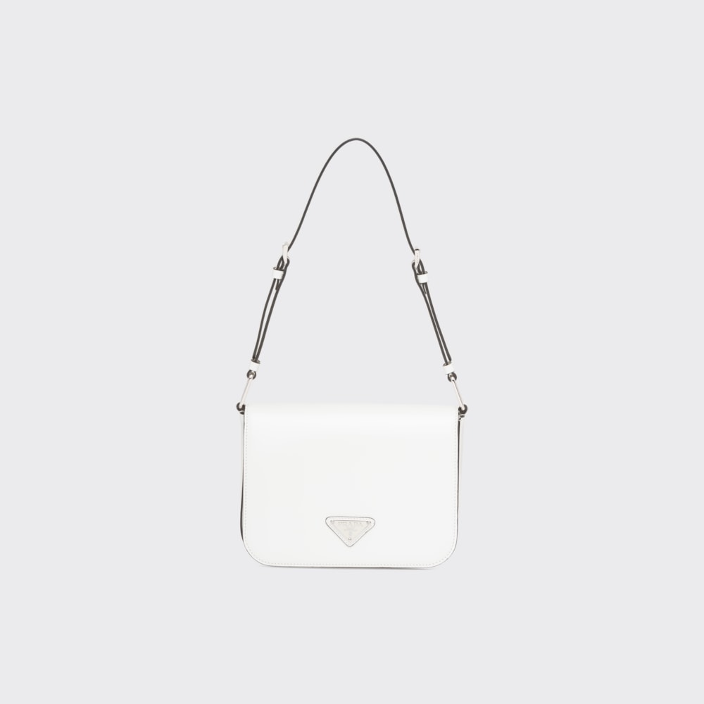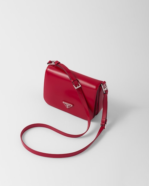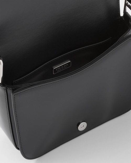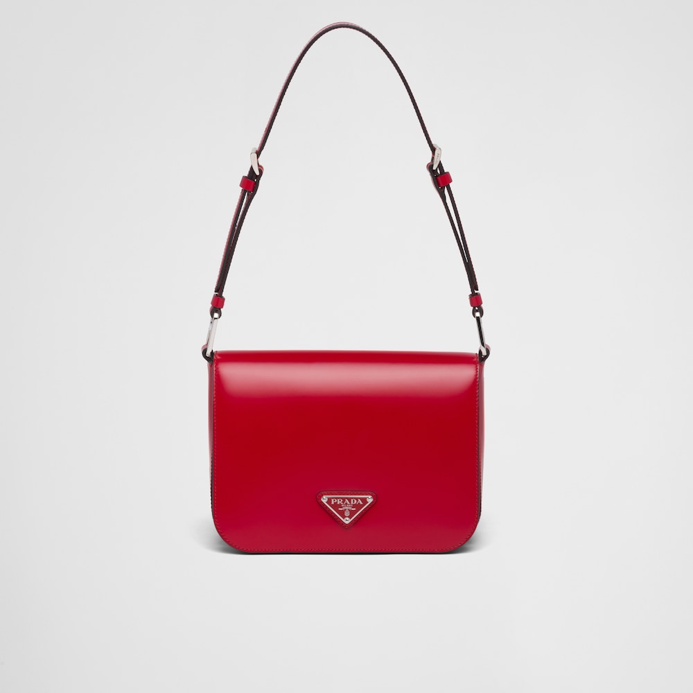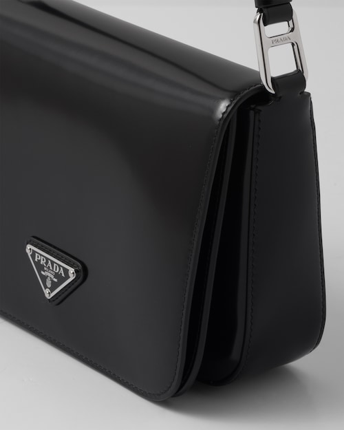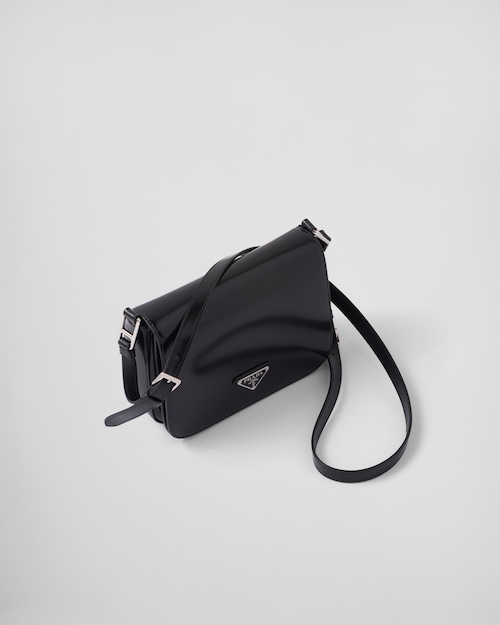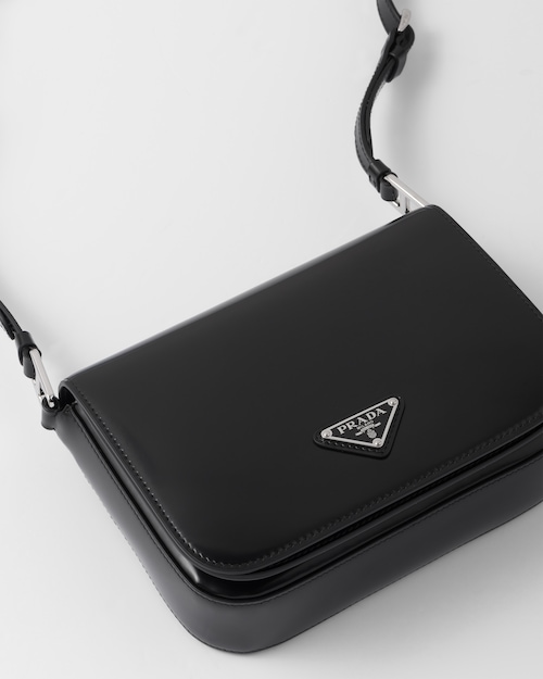 洗練されたモダンなライン、機能性、上質な素材を組み合わせ、優雅さと実用性を融合させたハイブリッドなバッグ。プラダを象徴する素材、ブラッシュドレザー(牛革)を使用した曲線的なデザイン。フラップ開閉式と、クロスボディバッグとしてもショルダーバッグとしても様々なシーンでお使いいただける調整可能なレザーショルダーストラップが特徴です。フラップには、創業者のマリオプラダが考案したロゴを現代的なデザインで再解釈したエナメルメタルのトライアングルロゴがあしらわれています。