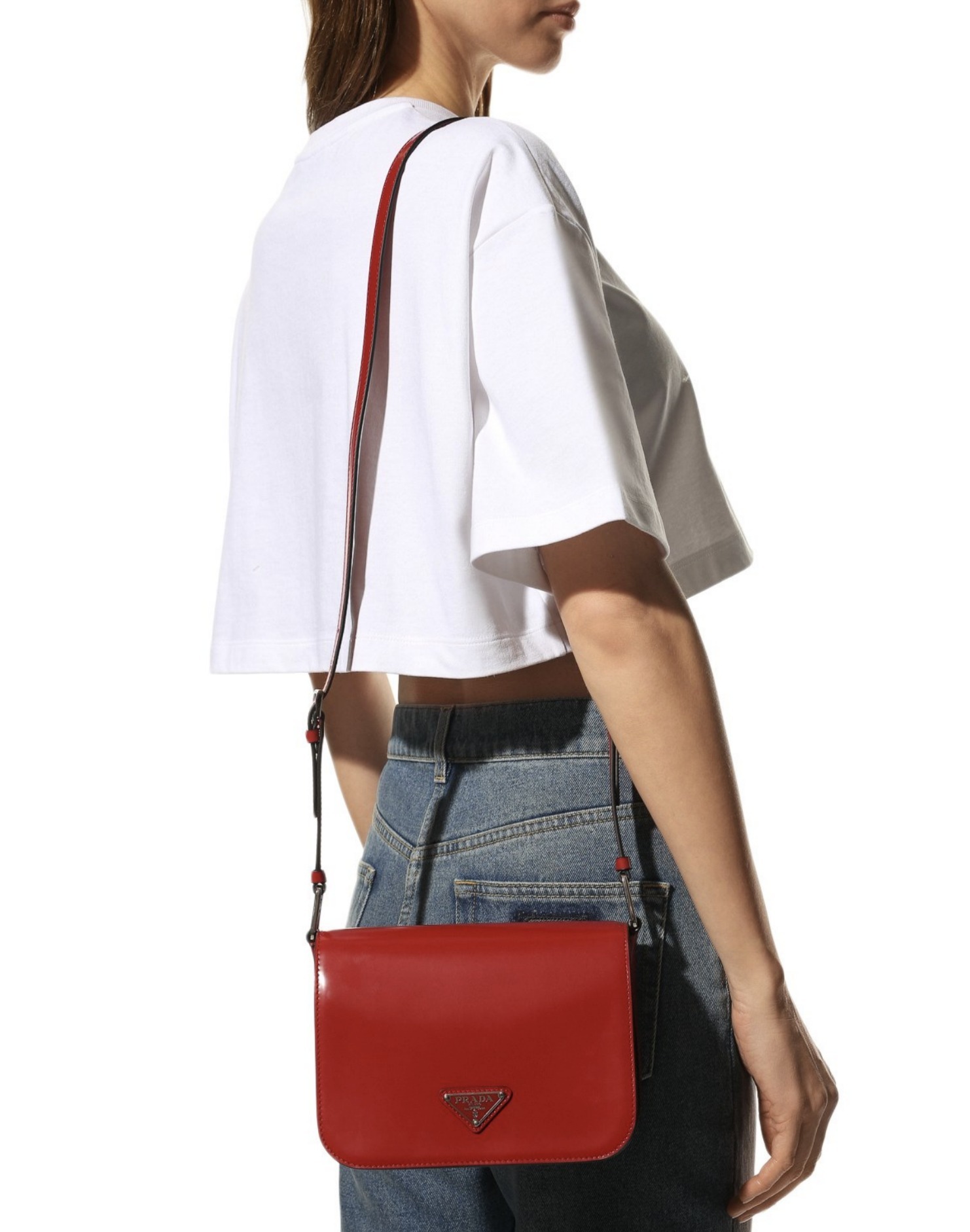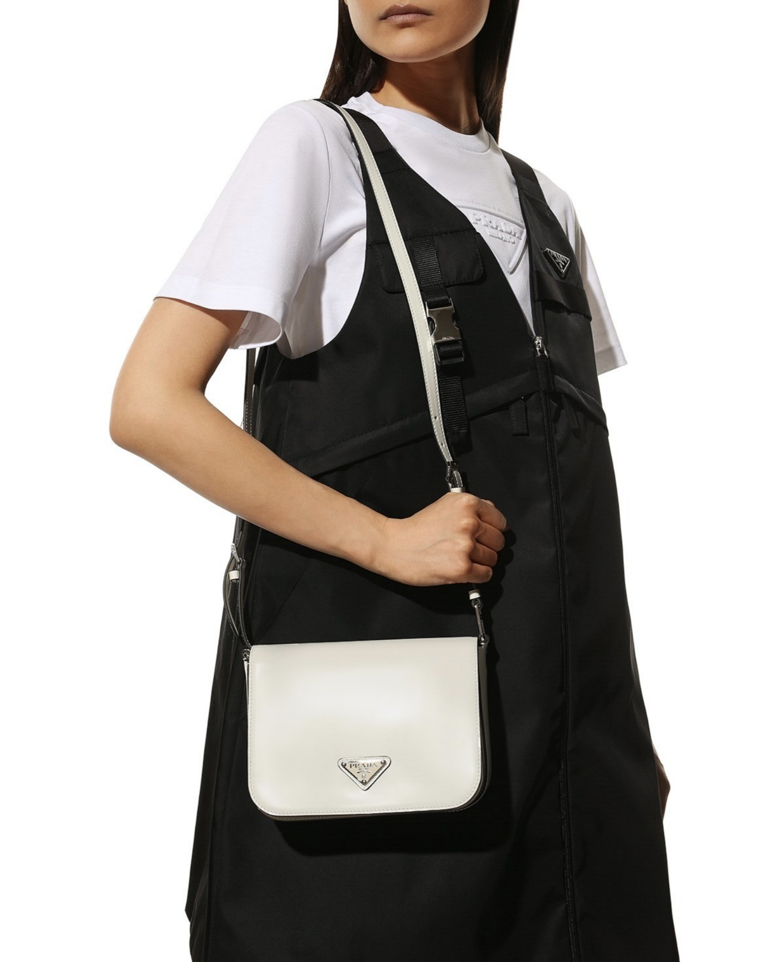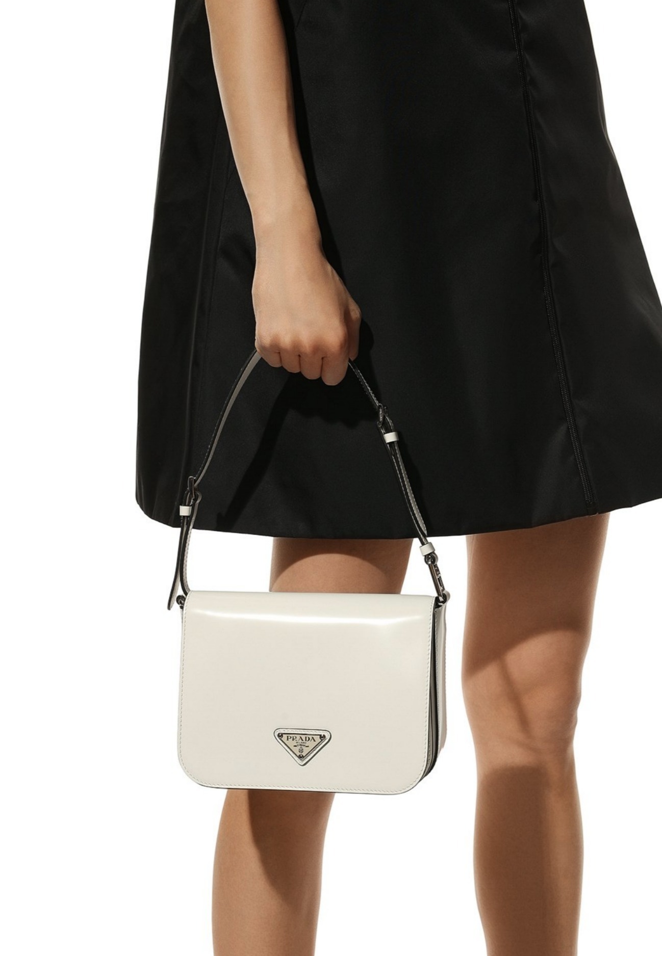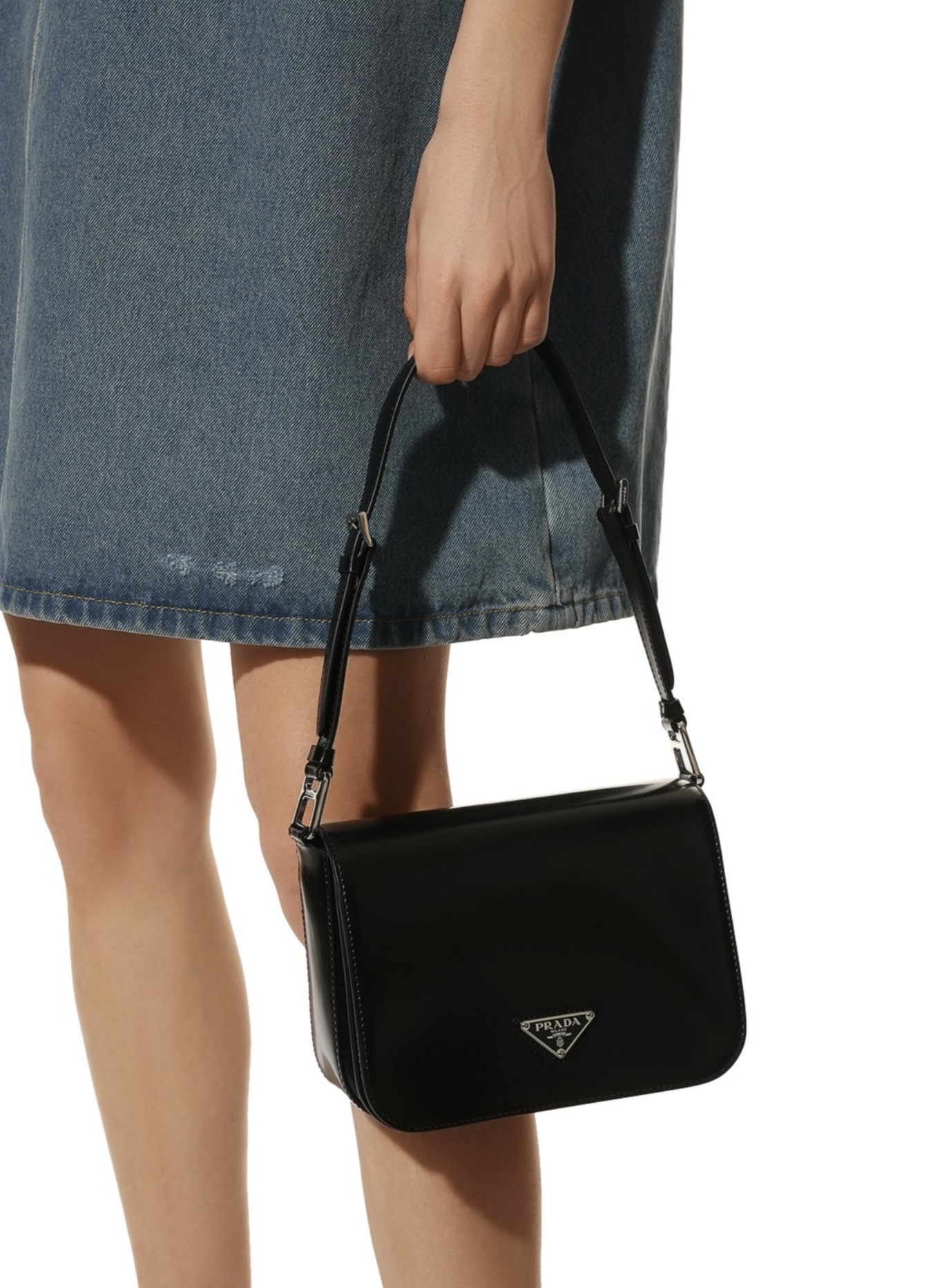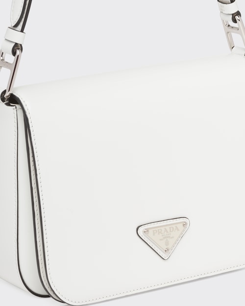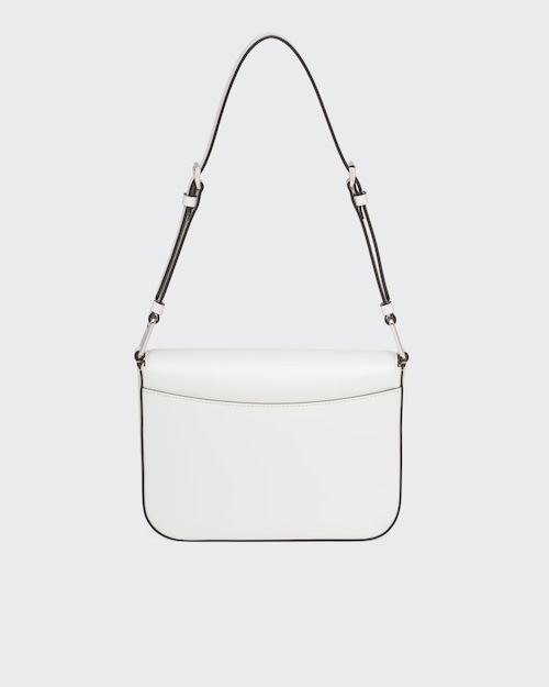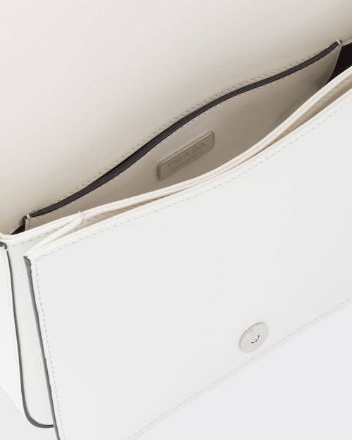 洗練されたモダンなライン、機能性、上質な素材を組み合わせ、優雅さと実用性を融合させたハイブリッドなバッグ。プラダを象徴する素材、ブラッシュドレザー(牛革)を使用した曲線的なデザイン。フラップ開閉式と、クロスボディバッグとしてもショルダーバッグとしても様々なシーンでお使いいただける調整可能なレザーショルダーストラップが特徴です。フラップには、創業者のマリオプラダが考案したロゴを現代的なデザインで再解釈したエナメルメタルのトライアングルロゴがあしらわれています。