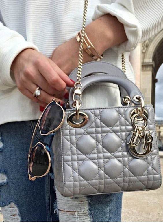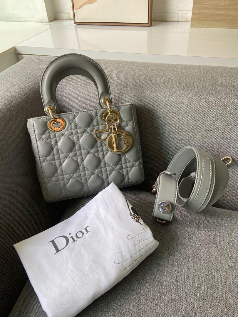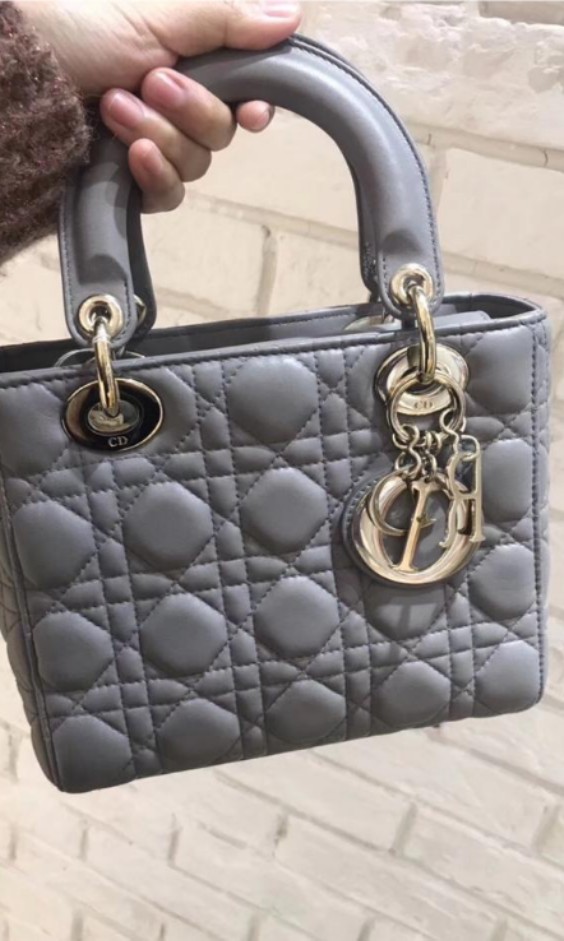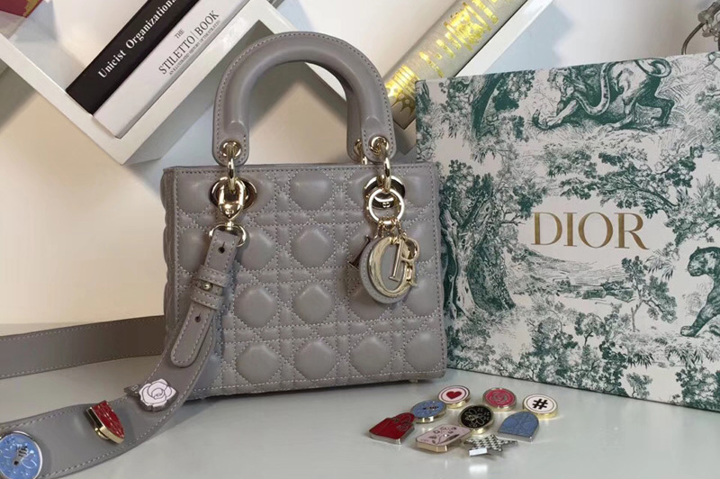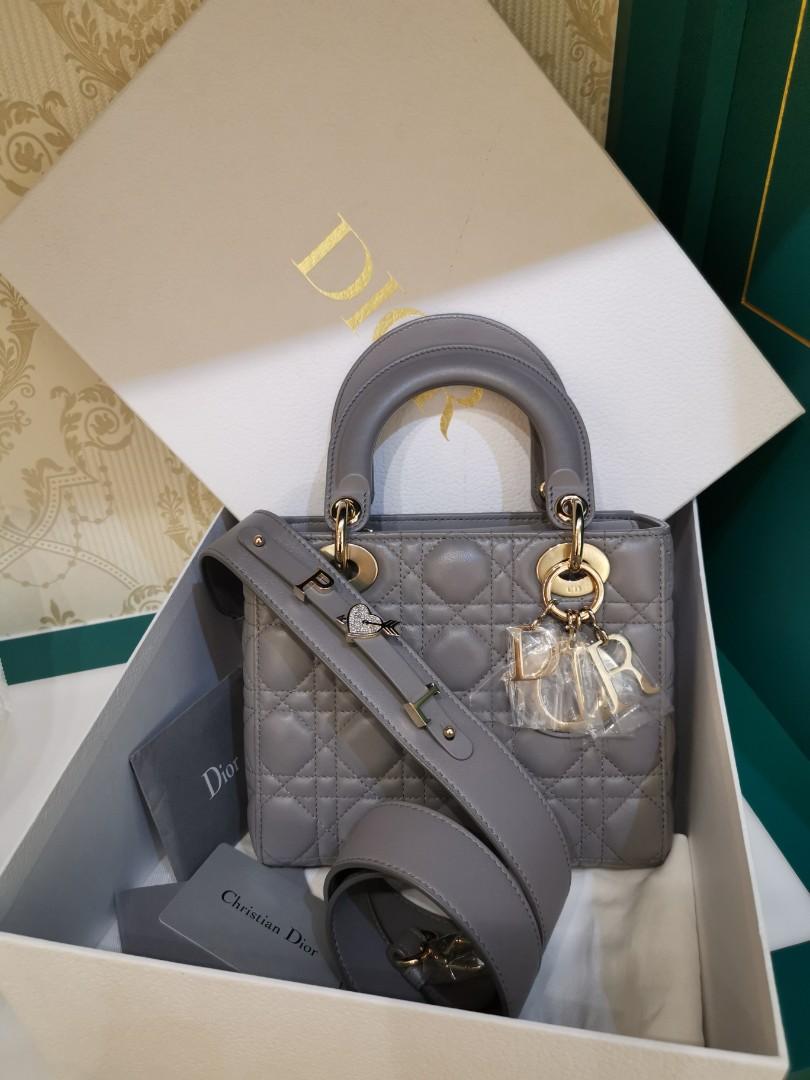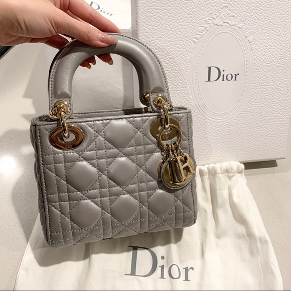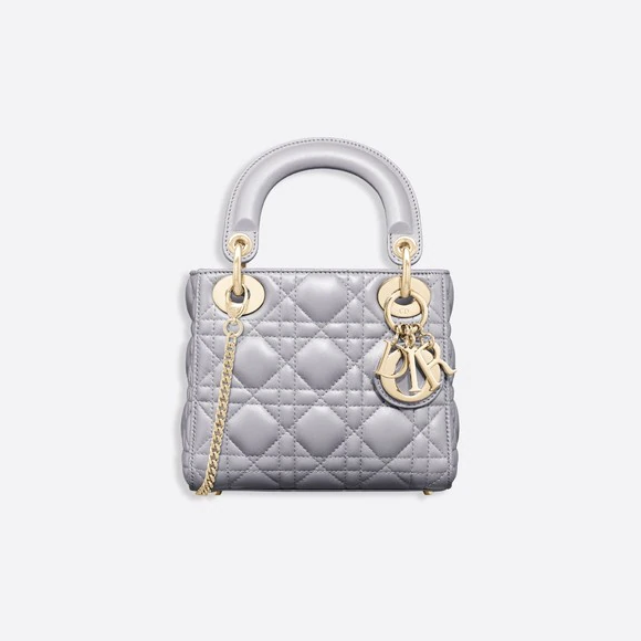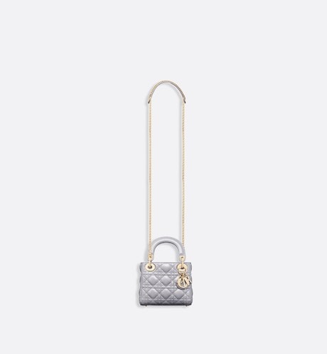 'カナージュ 'ステッチがあしらわれたグレーオパーリン パーリーラムスキンの ' Lady Dior(レディ ディオール)' チェーンミニバッグに、ペールゴールドメタルのアクセサリーが際立ちます。